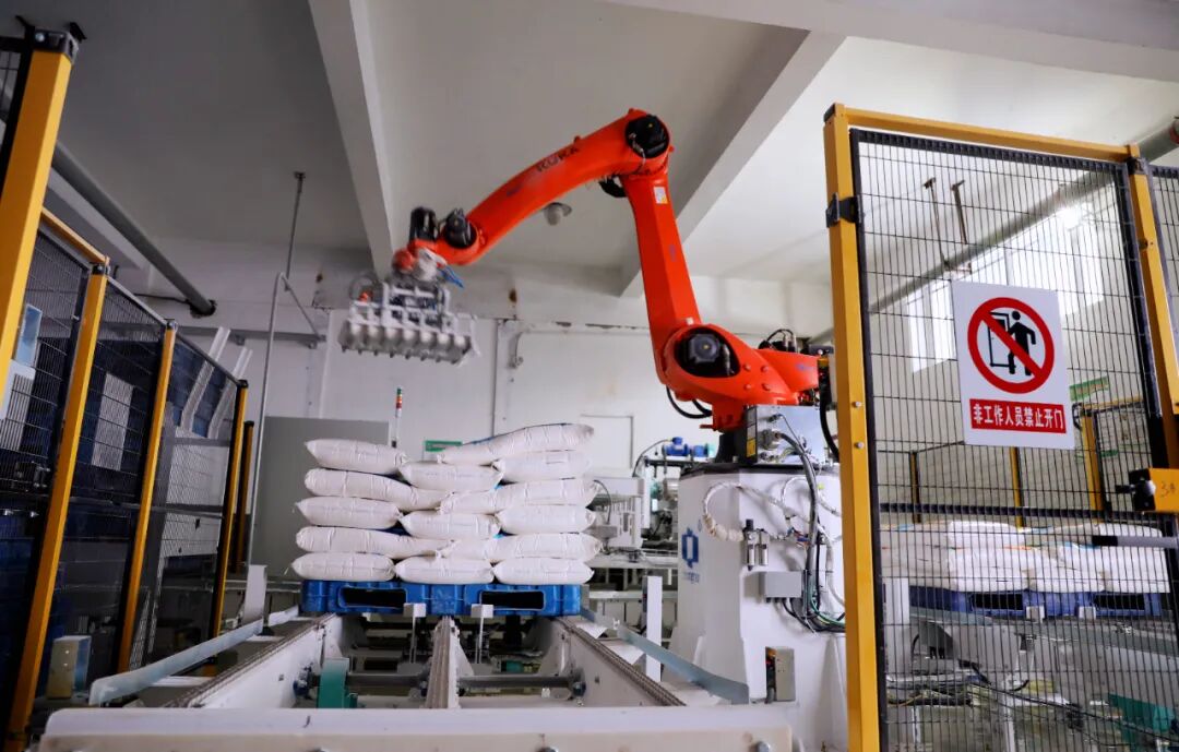 新疆塔城储绿粮油集团面粉加工有限公司车间机械码放包装好的面粉。