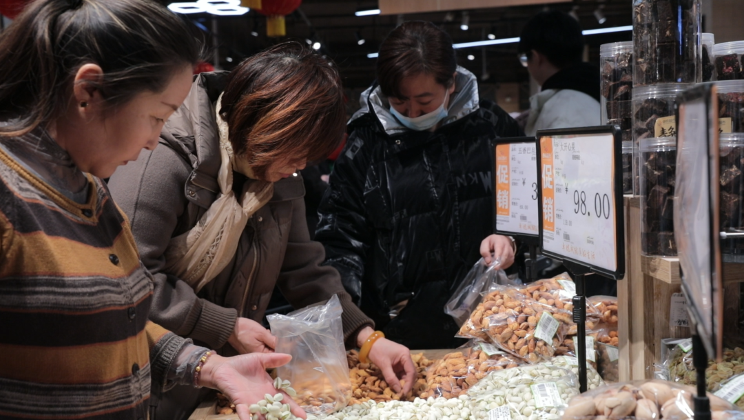 塔城市卓悦超市里多种商品换上喜庆红色包装,从传统对联、福字、灯笼,到现代零食大礼包、精美礼盒,品类丰富,满足不同消费需求。