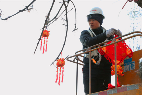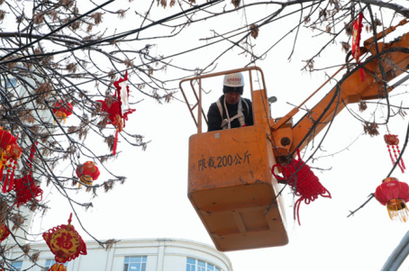 在额敏县的各大路口,工人们两两配合,正在利用登高作业车将各类新春挂饰戴到树木的枝头。象征团圆的灯笼,寓意吉祥的中国结,代表福气的福袋,一样样红红火火的装扮让年味在大街小巷里弥漫。