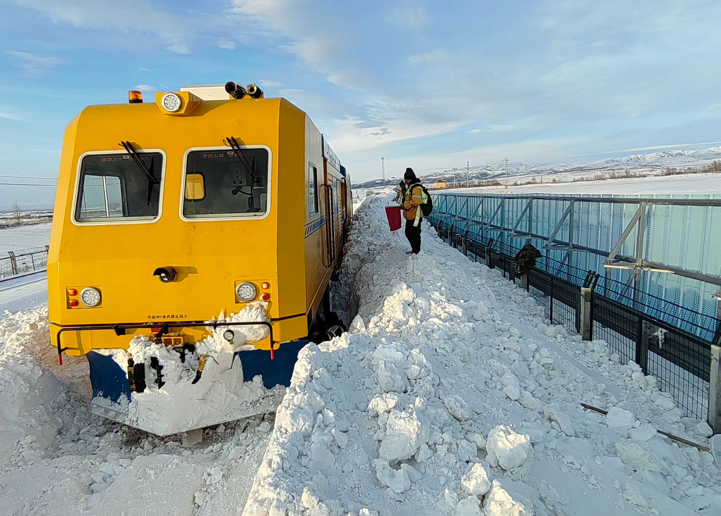 新疆玛依塔斯是我国乃至世界上罕见的暴风雪灾害区,被称为“魔鬼风区”。常年大风天气持续不断,尤其是近期的一场大雪过后风力达8级以上,风吹雪给铁路运输增加了风险。中国铁路乌鲁木齐局集团有限公司阿勒泰基础设施段额敏综合维修车间铁厂沟维修工队就驻守在克塔铁路的铁厂沟站里。16名工作人员是24小时随时待命,负责铁路线路的维修养护以及冬季的清雪除冰工作。每当遇到风雪天气,他们就携带铁锹、雪铲等工具,乘坐“大黄蜂”轨道除雪车,赶往铁厂沟至霍吉尔特区间进行清雪作业。"大黄蜂"轨道除雪车也成为应对风吹雪保障线路畅通的利器。