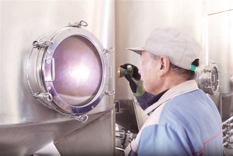 □新疆隆惠源药业有限公司工人在查看储存罐。 本报记者王全明摄