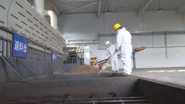 3月13日,在沙湾科发环保科技有限公司,污泥制肥车间工人正在查看成品。沙湾市融媒体中心记者 马金明 摄