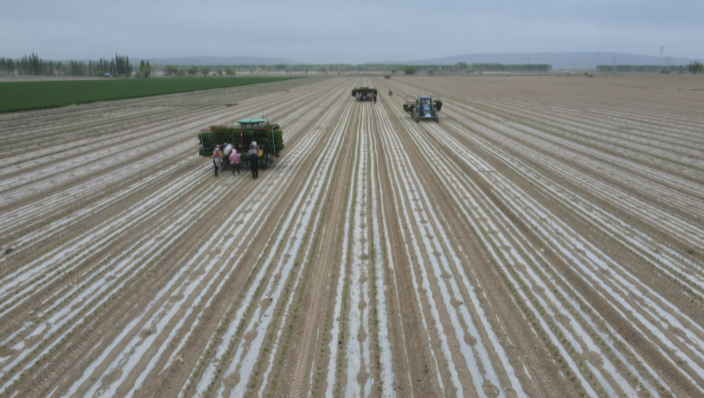 4月25日,走进沙湾市金沟河镇三道湾村柴国建家的田地里,4台辣椒移栽机正有条不紊地进行作业,打孔、栽苗、覆土、压实等工序一次性完成,所过之处,一行行辣椒幼苗整齐排列,为广袤的大地增添了新绿。