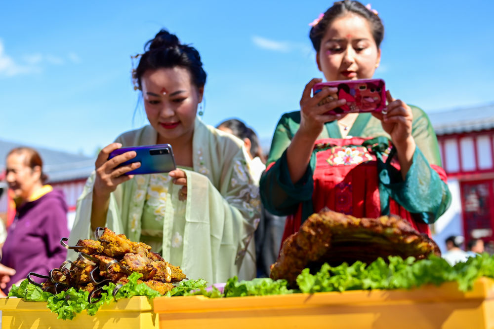 6月2日,在新疆塔城地区裕民县举行的首届巴什拜羊烹饪大赛上,观众在拍摄参赛菜品。新华社记者丁磊摄影报道