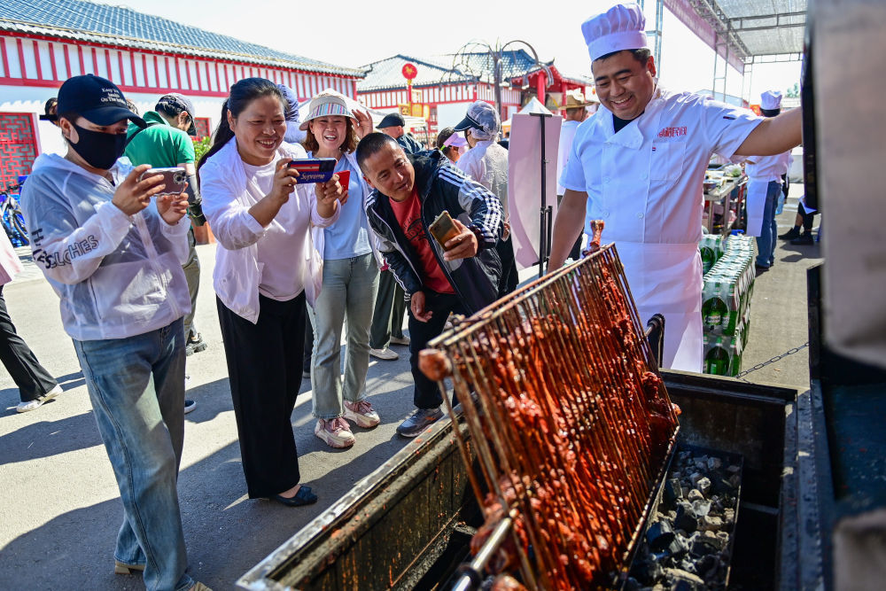 6月2日,在新疆塔城地区裕民县举行的首届巴什拜羊烹饪大赛上,观众在拍摄参赛厨师制作的烤全羊。新华社记者丁磊摄影报道