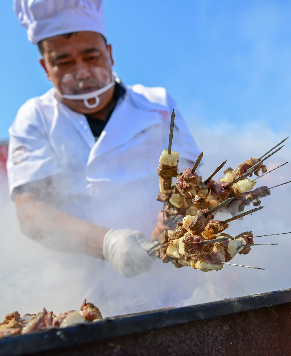 6月2日,在新疆塔城地区裕民县举行的首届巴什拜羊烹饪大赛上,参赛厨师在烤羊肉串。新华社记者丁磊摄影报道