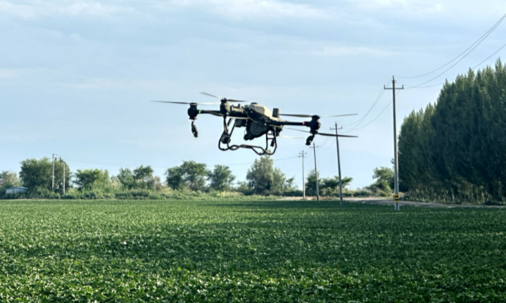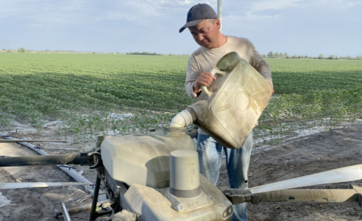 李彦发说:“近期气温迅速升高,棉花的生长速度很快,就想给它控制一下,因为长得太快、太高到后期容易倒伏,180亩地1个多小时就能完成植保。”