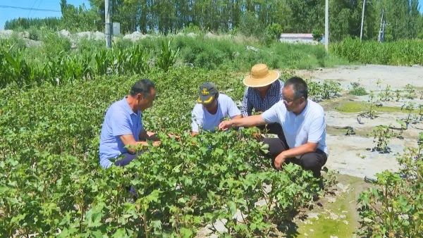 6月22日,在皇宫镇林家庄子村村民刘丰胜家棉花地里,针对他家棉花受多变天气影响出现的田管问题,农业技术和农机服务中心技术人员又一次来到他家棉田,细心观察棉花长势情况,并对刘丰胜给出了切实可行的田间管理建议。