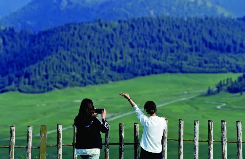 游客在沙湾市鹿角湾景区拍照打卡。资料图片