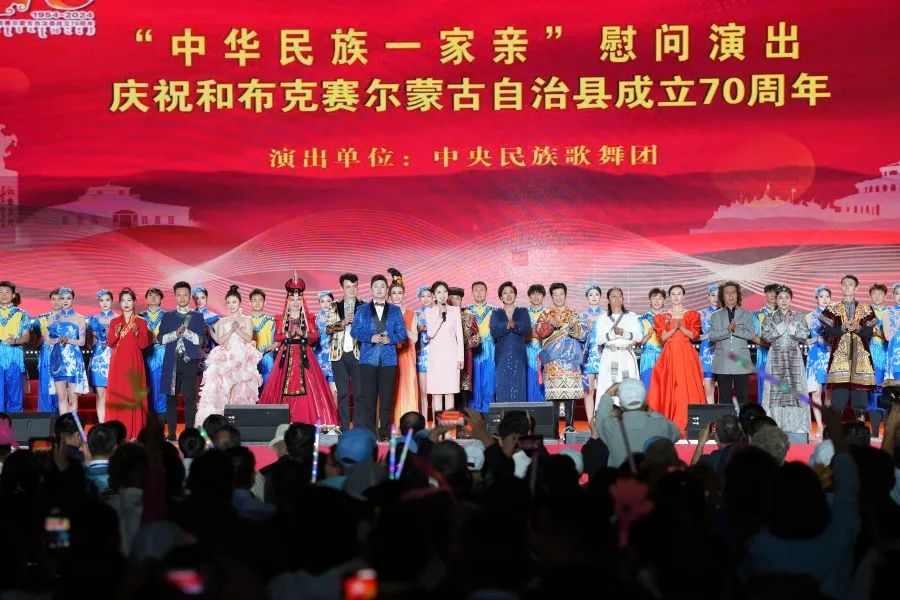 7月31日,在和布克赛尔蒙古自治县成立70周年的喜庆时刻,中央民族歌舞团来和布克赛尔县慰问演出。