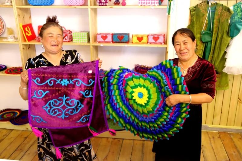 村民阿孜古丽·艾买特(右)和努尔孜雅·朱玛得力展示手工刺绣产品。