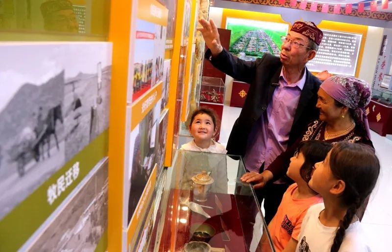 村民朱曼·胡代拜根一家在村史馆参观。