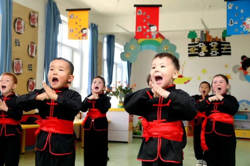 阿克铁克切村幼儿园的孩子们学习中国功夫。