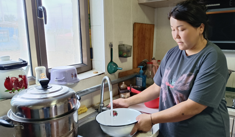 村民努尔恰提·巴依哈站在接自来水。塔城地区融媒体中心记者王高升摄
