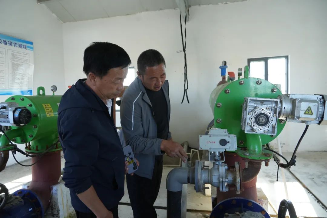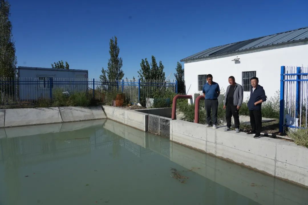 西大沟镇农业部门工作人员查看高标准农田蓄水池情况。