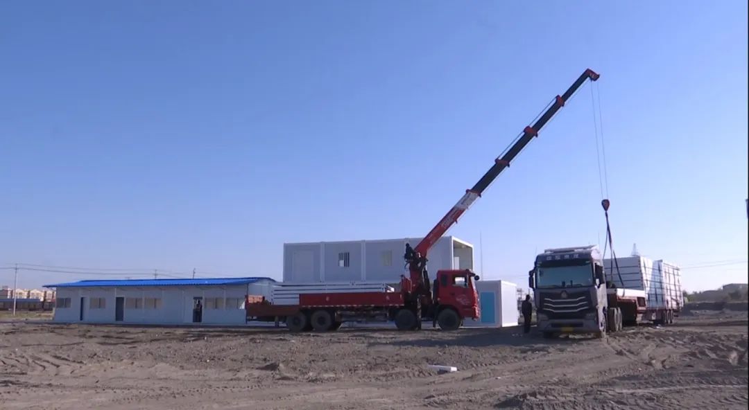 10月6日,在沙湾市15万kw/8h/120万kwh固体储热共享储能电站项目建设工地,吊车正在进行吊装作业,工人们正在安装活动板房,部分活动板房已完成搭设,施工场地已完成平整。