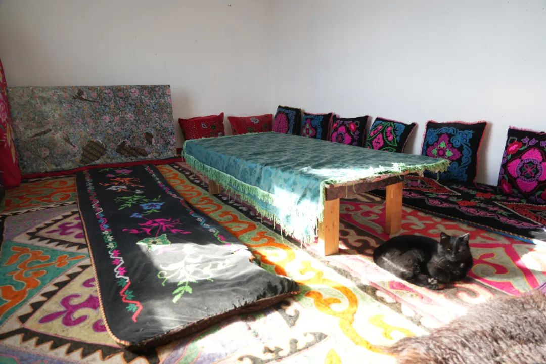 走进屋内,厨房里炉火烧得正旺,火炉上搪瓷茶壶里的茶水咕咕地冒着热气。卧室里,洁白的墙上挂着一个鲜红的中国结,板炕上铺着色泽艳丽的花毡。午饭时间,外出放牧的库尔曼台回到家中,享受温暖的午餐时间。