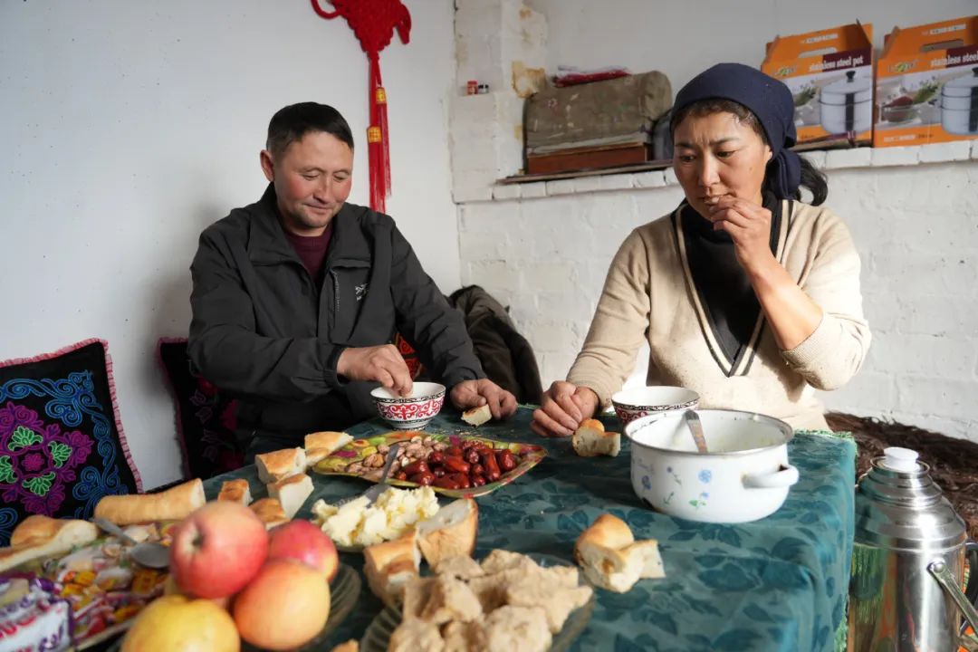 库尔曼台·木合马合和妻子享用午餐。塔城地区融媒体中心 记者代姣美摄