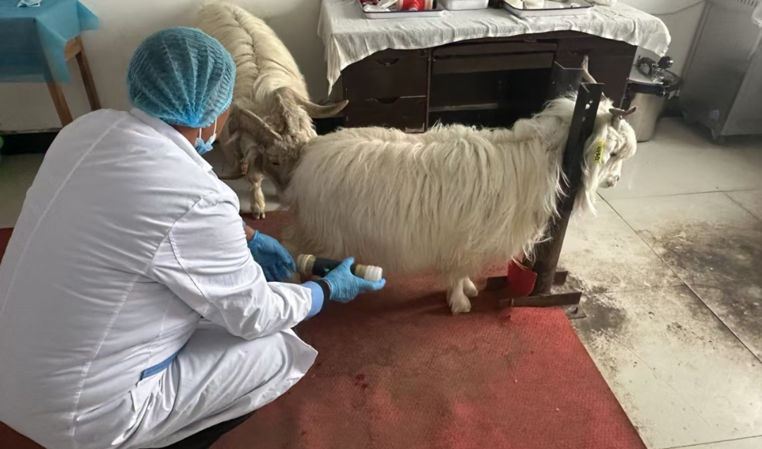 技术人员在做人工授精。塔城地区融媒体中心通讯员阿劳摄