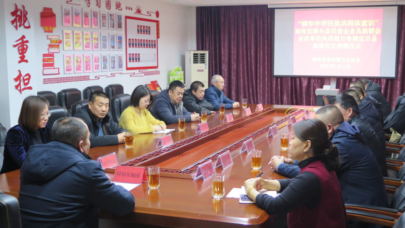 1月10日,和布克赛尔县民营企业联合县域新的社会阶层人士联合会会员单位,在新疆全荣投资集团有限公司一楼会议室共同开展向西藏地震灾区捐款仪式。