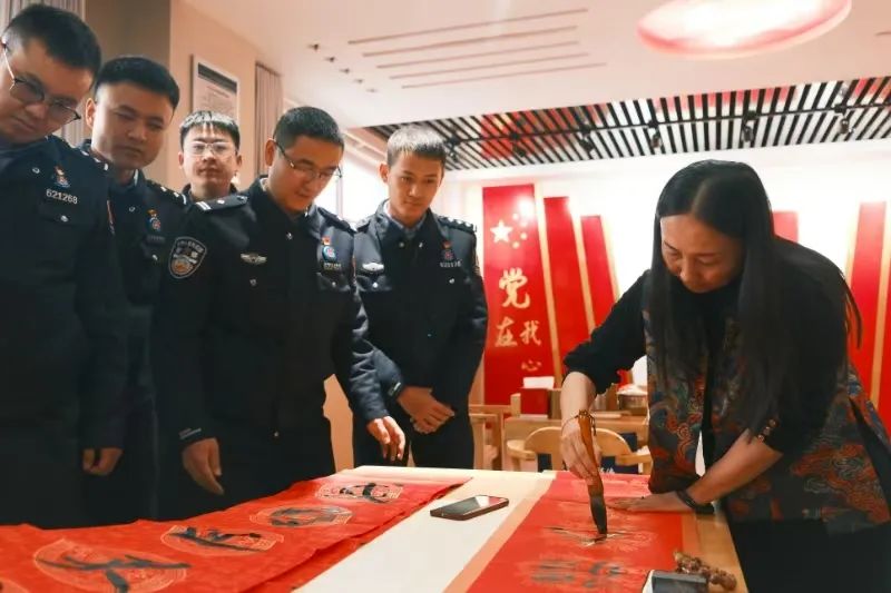 活动现场,书法家们纷纷挥笔泼墨,一副副寓意平安和谐、吉祥如意的春联,承载着书法家们对民辅警的真挚祝福和关爱,让大家体会到浓浓的新春喜庆氛围。