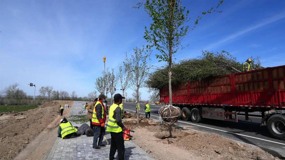 施工人员装卸、栽种风景树。塔城地区融媒体中心记者王高升摄