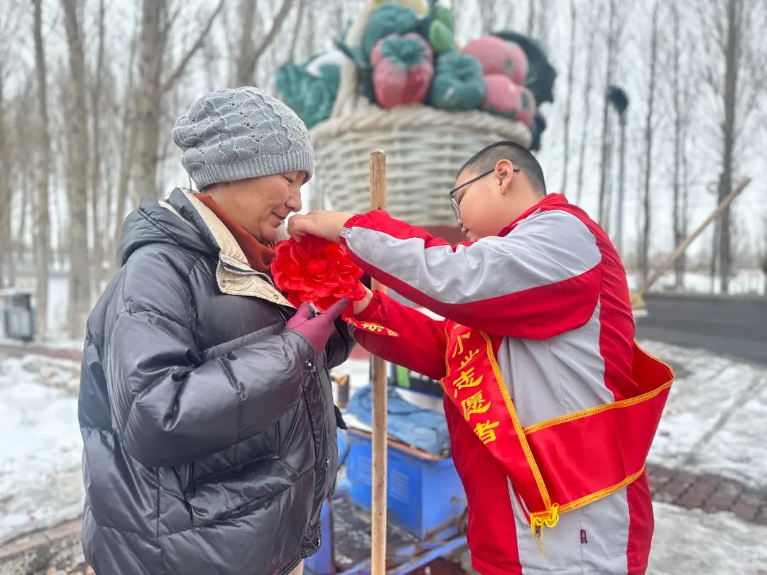 活动中,青年志愿者与师生代表为辖区环卫工人准备了热气腾腾的奶茶,并为他们送上了亲手制作的大红花。冒着热气的奶茶驱散了劳动的辛劳和初春的寒意,胸前的红花鲜艳夺目,映照着环卫工人质朴的脸庞。