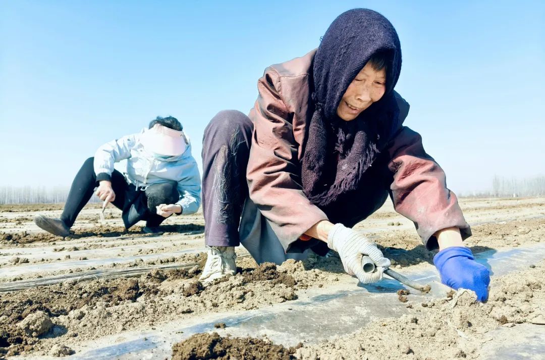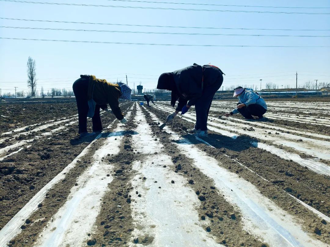 3月19日,在乌兰乌苏镇皇宫新村的农田里,农户田建东正在田间播种蚕豆。只见创新一边拿着小铲挖坑,一边将种子埋进土里,压实。