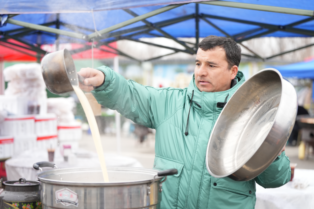 摊主展示刚出锅的热奶茶。塔城地区融媒体中心记者苏珊琳摄
