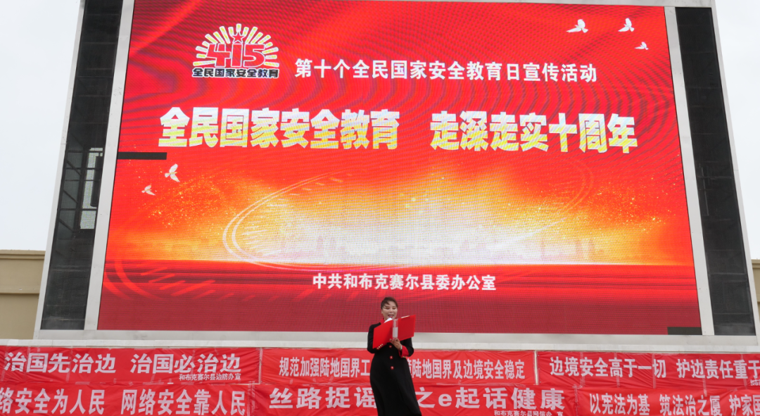 4月15日,和布克赛尔县委办公室联合县委机要保密局、国安办组织成员单位县委政法委、公安局、边境管理大队、边防事务管理中心、法学会、公检法司等48个县直单位和2个乡镇,在和布克赛尔县体育广场集中开展了以“全民国家安全教育 走深走实十周年”为主题的宣传系列活动,形式多样的活动吸引了众多群众驻足参与。