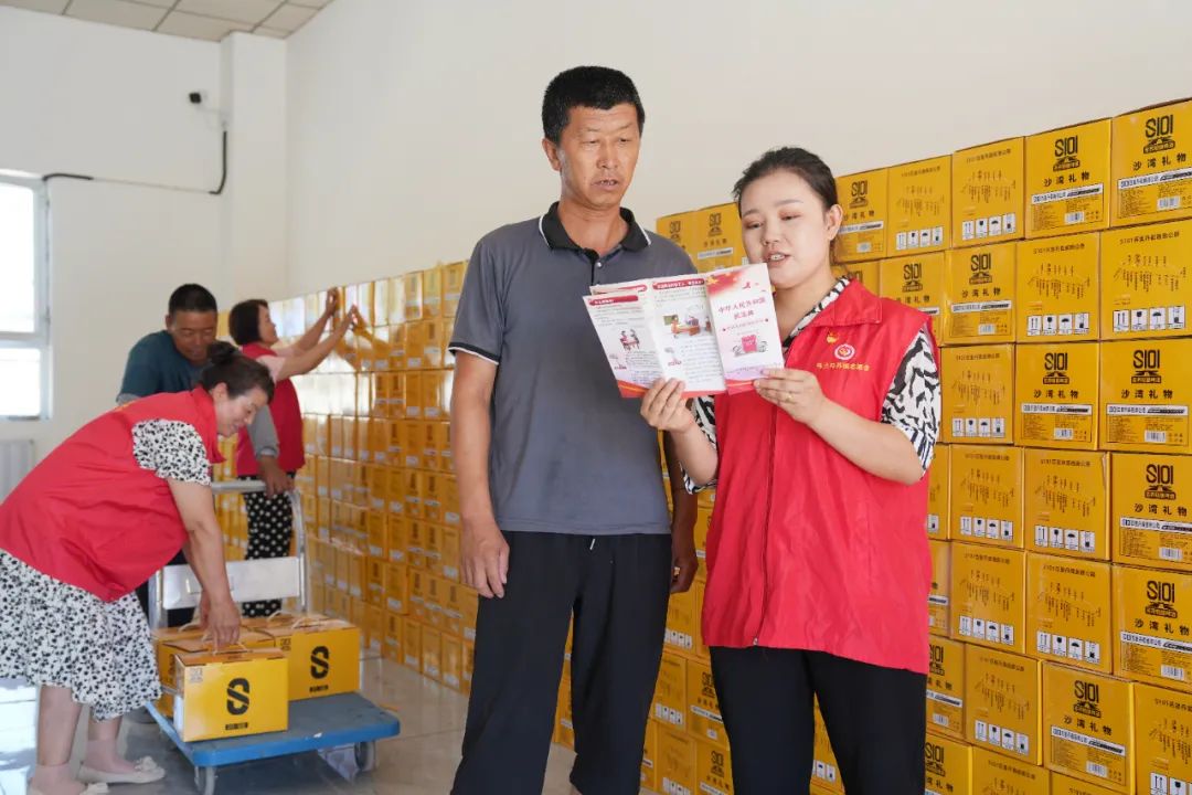 沙湾市下沉年轻干部为村级企业职工讲解惠企便民政策、帮助整理货物。
