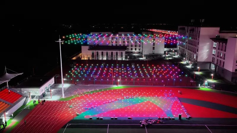 暮色未沉时,锦裕高级中学操场上人山人海,各族群众挤挨着,有的跟机器人热情互动,有的翘首望空,满是对无人机表演的期待。表演开始后,无人机在夜空中次第变幻着,以璀璨灯光勾勒出各色景象:巴尔鲁克山变幻莫测、“一花一羊富民间”字样亮眼,小白杨哨所剪影肃穆,又化作锦裕高级中学模样,最后当无人机群化作“70”字样缓缓升空时,现场更是响起阵阵欢呼。