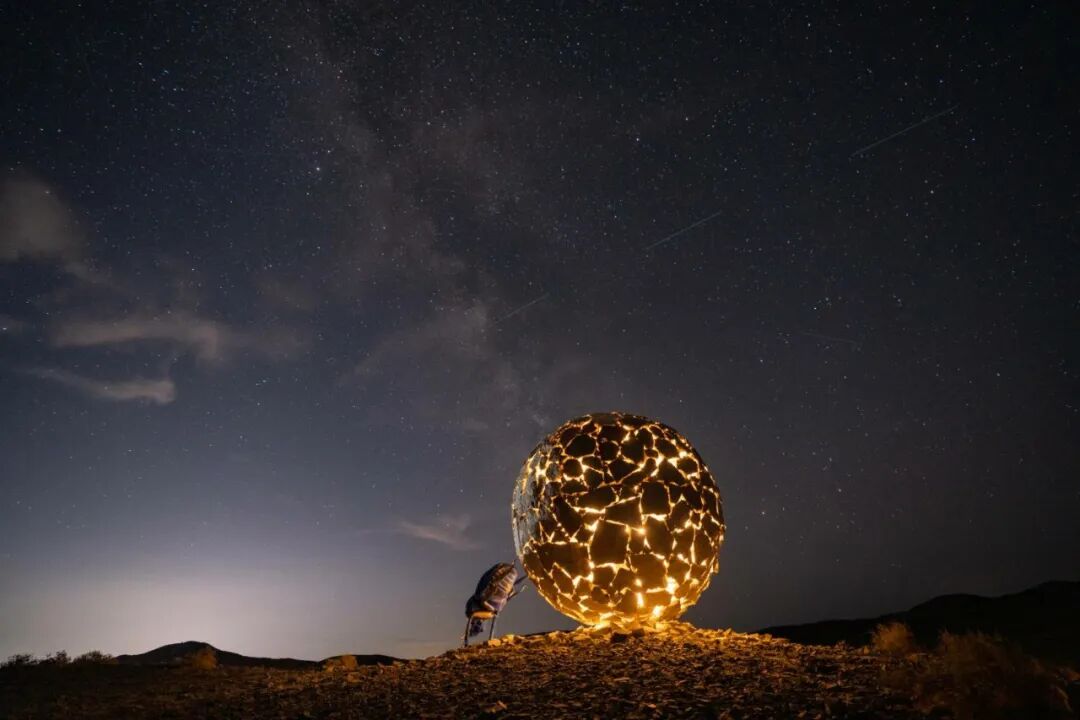 赖俊杰作品《加载日光》,以“加载日光”为核心概念,将数字世界里“等待加载”的动态过程,转译为荒漠大地上的静态艺术装置。借几何形体模拟太阳光芒辐射形态,把虚拟的“加载期待”落地为真实可触的艺术存在,在旷野空间构建自然与数字、现实与期待的连接点,让观者在天地苍茫间,感受“日光加载”的诗意等待,唤起对光芒降临、美好将至的憧憬,以及对数字符号与自然本真融合的思考 。