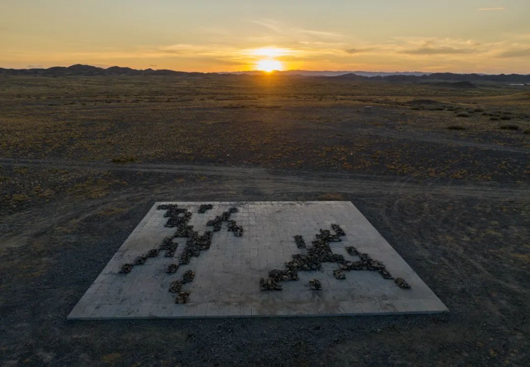 窦付坤作品《后·一亿年后·在托里》,用本地区域亿万年的石材,以在地性创作方式,让艺术介入荒野戈壁滩空间中,石材深沉与厚重给人一种不一样的视觉张力。