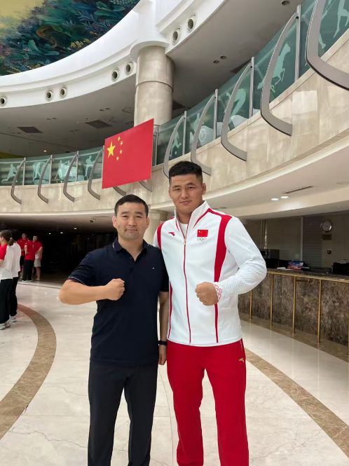 2024年8月哈比拉·阿吾萨衣满启程奔赴巴黎奥运会前,新疆摔跤队男子自由式摔跤队主教练达吾提努尔·吐尔为他送上了祝福。