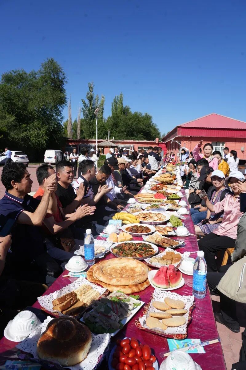坚持升旗16年的沙勒克江·依明大叔来了,多民族家庭代表黄英、哈力旦·依拉洪来了。随着各族居民陆续到来,各民族特色的美食纷纷摆上长桌。伴随着欢快的手风琴曲,百家宴开席了。