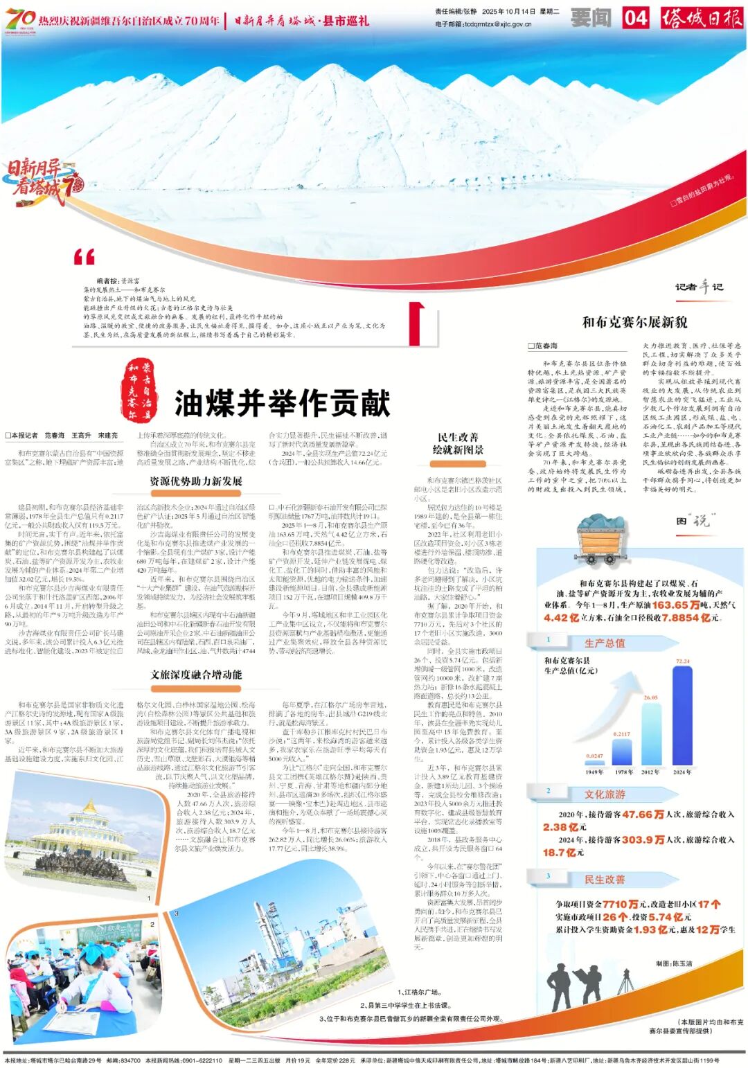 七秩风华映天山,万里边疆谱新篇。70年来,塔城地区的每一个县市都在时代浪潮中书写着属于自己的蜕变华章。70年的跨越,不仅是经济数据的攀升、基础设施的完善,更是民生福祉的普惠、民族团结的升华。在新疆维吾尔自治区成立70周年之际,我们怀着无比崇敬与喜悦的心情,推出这份聚焦塔城地区的特刊,以文字为笔、以影像为镜,全景式巡礼这片土地上日新月异的变迁,深情讲述各族儿女携手奋进的动人故事。今天推出的是:《和布克赛尔蒙古自治县:油煤并举作贡献》。