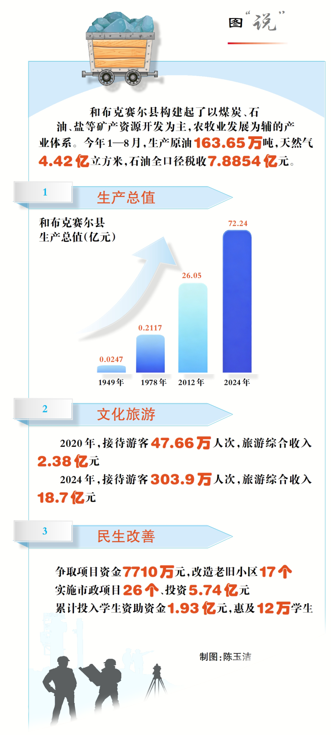 走进和布克赛尔县,能真切感受到在党的光辉照耀下,这片美丽土地发生着翻天覆地的变化。全县依托煤炭、石油、盐等矿产资源开发转换,经济社会实现了巨大跨越。