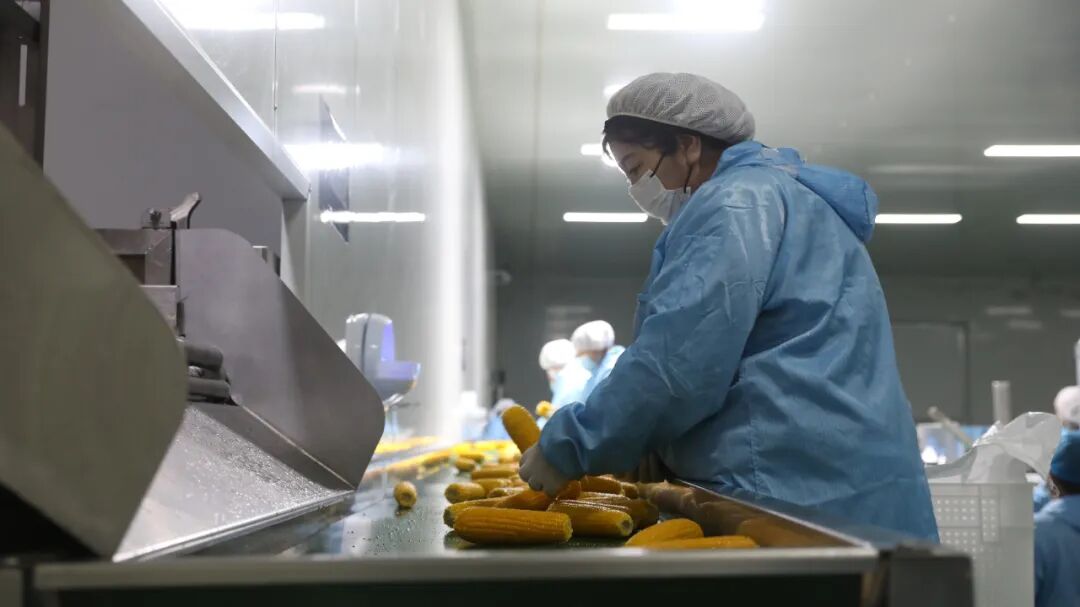 玉米加工厂的工作人员将流水线上的玉米进行修整。