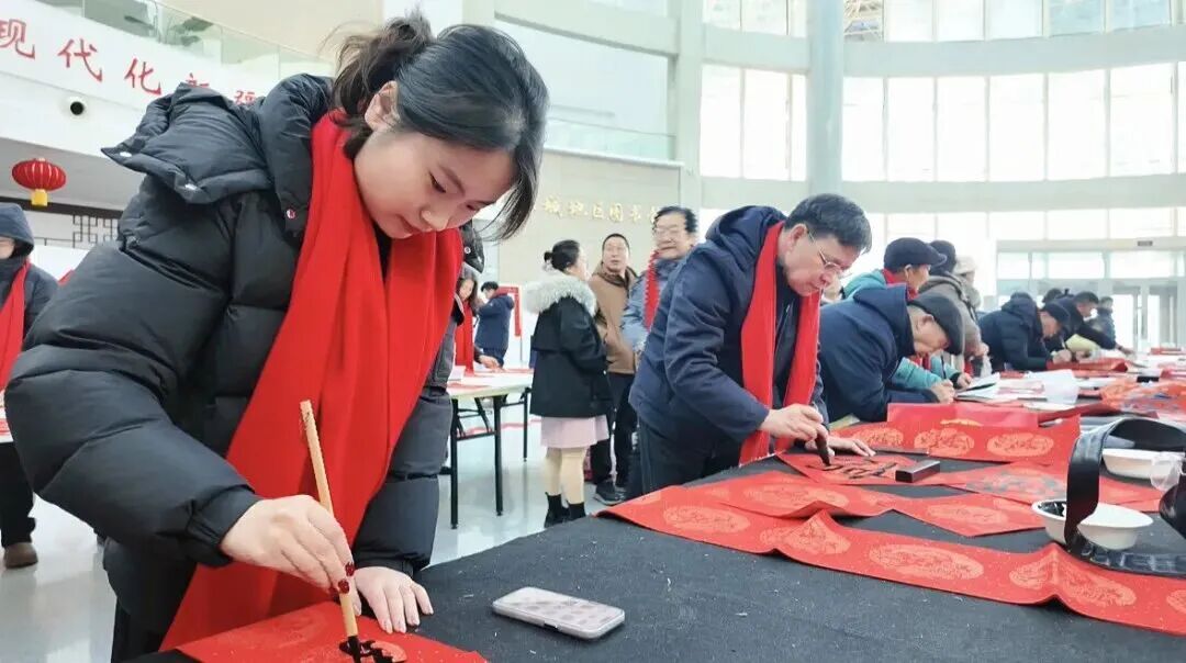 现场另一侧,墨香与年味交织,成为活动最温暖的风景线。书法家们凝神挥毫,楷书端庄规整、行书行云流水、草书洒脱奔放,一副副笔力遒劲、寓意吉祥的春联跃然红纸上。各族群众纷纷驻足围观、精心挑选,手中捧着红彤彤的春联与“福”字,脸上满是喜悦,期待着将这份温暖贴上门楣,为新春佳节增添喜庆。
