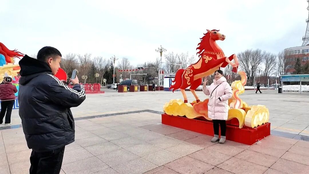 在塔城文化广场,“瑞马迎春”“灯耀塔城”两大主题灯组气势十足、熠熠生辉,以灵动的骏马造型寓意着新一年马到成功、诸事顺意,成为各族群众拍照打卡的首选地标。