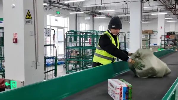 邮政分拣员在流水线上高效分拣包裹,保障春节期间寄递服务高效运转。