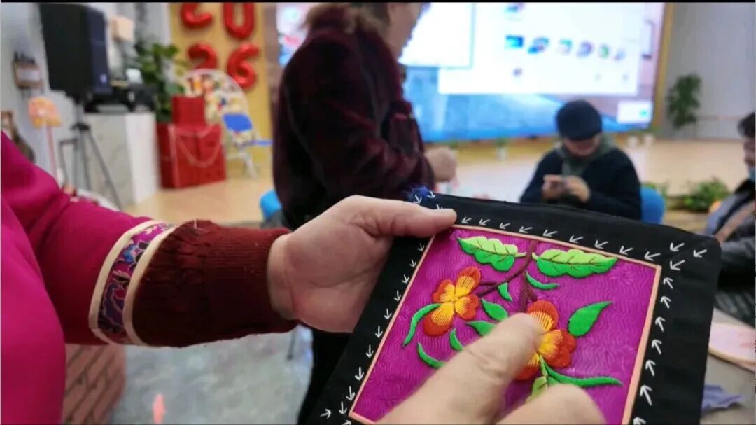 从穿线、起针,到调整针距松紧,再到纹样定位、色彩搭配,春英始终俯下身子,耐心地手把手教学、拿着绣绷亲自示范,只要发现有人针法偏差,便立刻上前细心纠正,把看似高深的非遗技艺拆解成简单易懂的步骤,哪怕是从未拿过绣针的零基础新手,跟着学上一会儿就能轻松上手,越绣越有兴致、越绣越有成就感。
