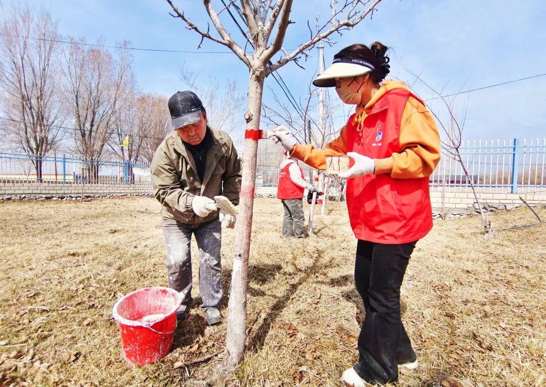 皇宫镇党员志愿者塔布勒合特蒙古族乡组织志愿者开展树木刷白护绿活动。
