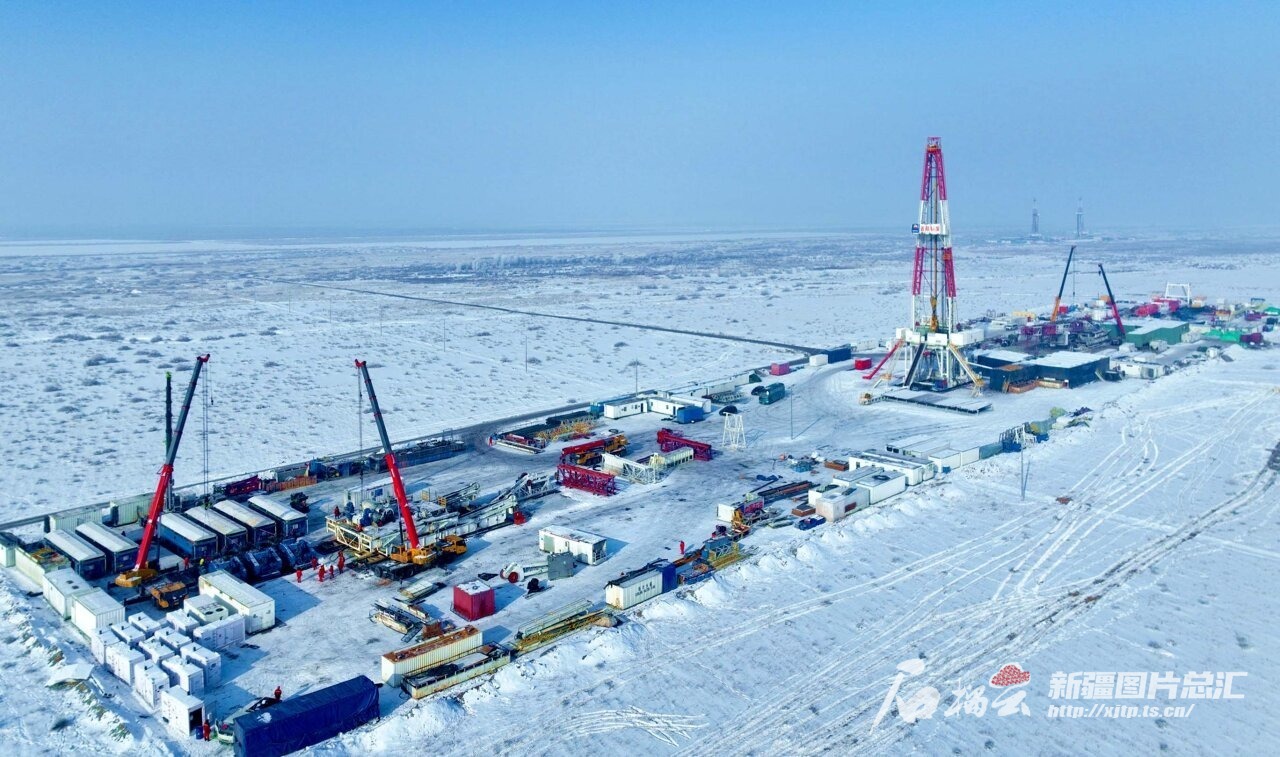 1月24日,中国石油集团西部钻探工程有限公司准东钻井公司70088钻井队员工在吉木萨尔页岩油JHW81号平台安装钻井设备。周建玲 摄