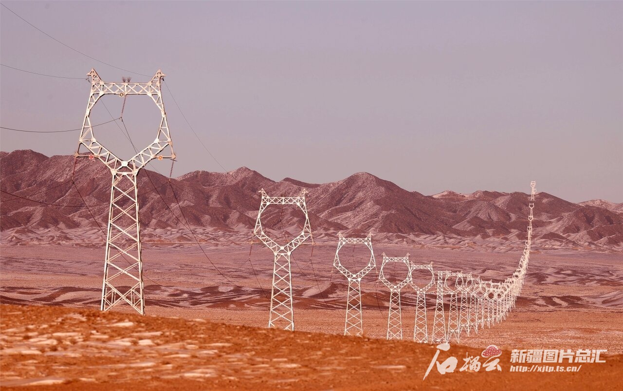 1月22日,在新疆生产建设兵团第六师北塔山牧场风力发电场,高压输电线路电力塔整齐排列,向外输送电能。李华北 摄