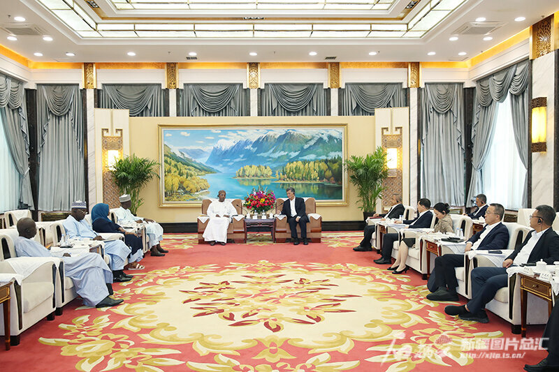 7月3日,自治区党委书记马兴瑞、自治区主席艾尔肯·吐尼亚孜在乌鲁木齐会见来新疆访问的乍得爱国拯救运动总书记巴达及所率代表团一行。天山网-新疆日报记者 崔志坚摄