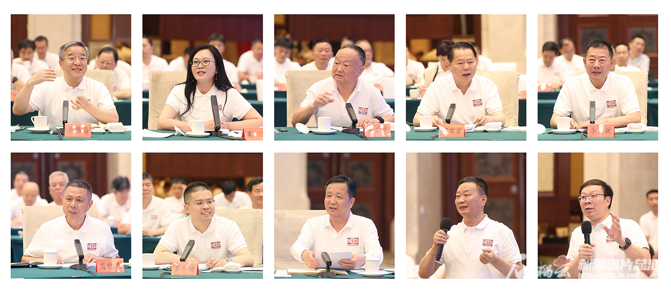 会上,万向集团董事长鲁伟鼎、依文集团董事长夏华、山东五征集团董事长姜卫东、月星集团董事局主席丁佐宏、黑龙江飞鹤乳业董事长冷友斌、天合光能董事长高纪凡、合盛硅业总经理罗烨栋、特变电工董事长张新、海天集团董事长费功全、优刻得董事长季昕华10位民营企业家代表先后发言(由左至右、由上至下)。天山网-新疆日报记者 崔志坚摄