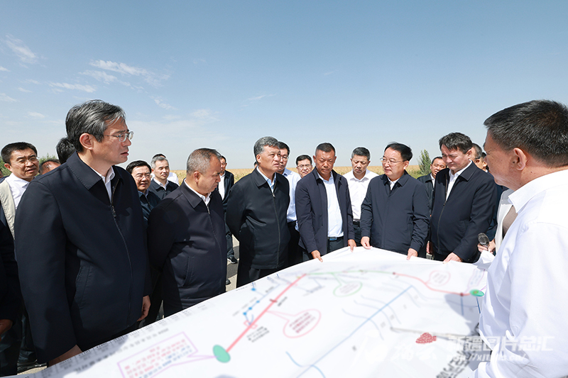 9月15日,自治区党委书记马兴瑞,自治区党委副书记、自治区主席艾尔肯·吐尼亚孜等在阿羌镇实地考察且末县后备土地开发工作,听取车尔臣河水资源分布和利用情况介绍。天山网-新疆日报记者 崔志坚摄