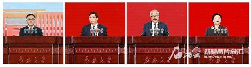 9月21日,在庆祝新疆大学建校100周年大会上,新疆大学党委书记代斌、清华大学党委书记邱勇、吉尔吉斯斯坦比什凯克国立大学校长穆萨耶夫·阿卜杜尔达、新疆大学校友代表王蓁分别致辞(由左至右)。天山网-新疆日报记者 崔志坚摄
